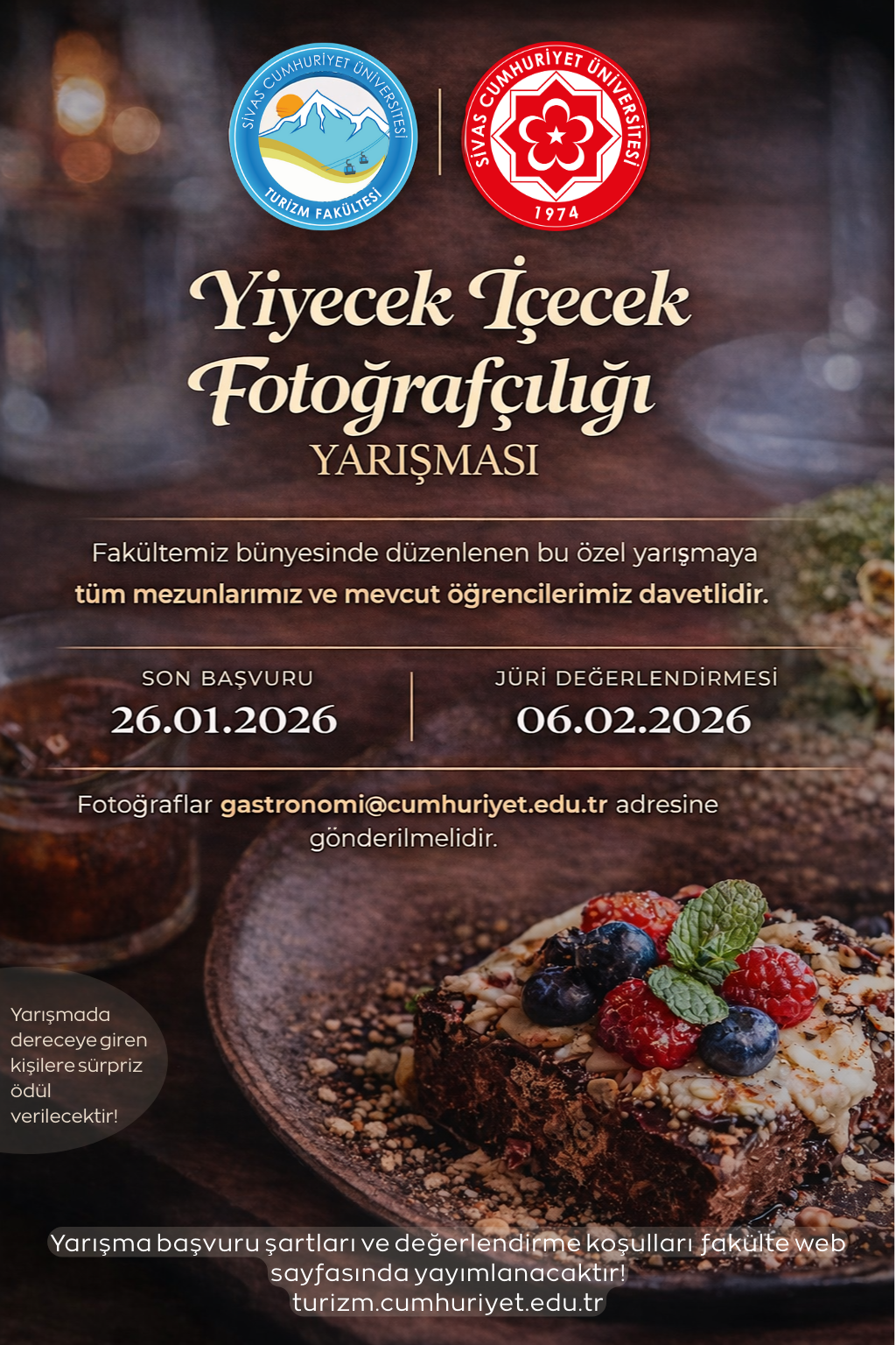 Gastronomi ve Mutfak Sanatları Bölümü ile Turizm işletmeciliği bölümü öğrencilerimize yönelik olarak “Yiyecek-İçecek Fotoğrafçılığı Yarışması” düzenlenmektedir. Bu yarışma, öğrencilerin görsel sunum becerilerini geliştirmeyi, gastronomik estetiği fotoğraf sanatı ile buluşturmayı ve bölümün uygulamalı çalışmalarını sergilemeyi amaçlamaktadır.