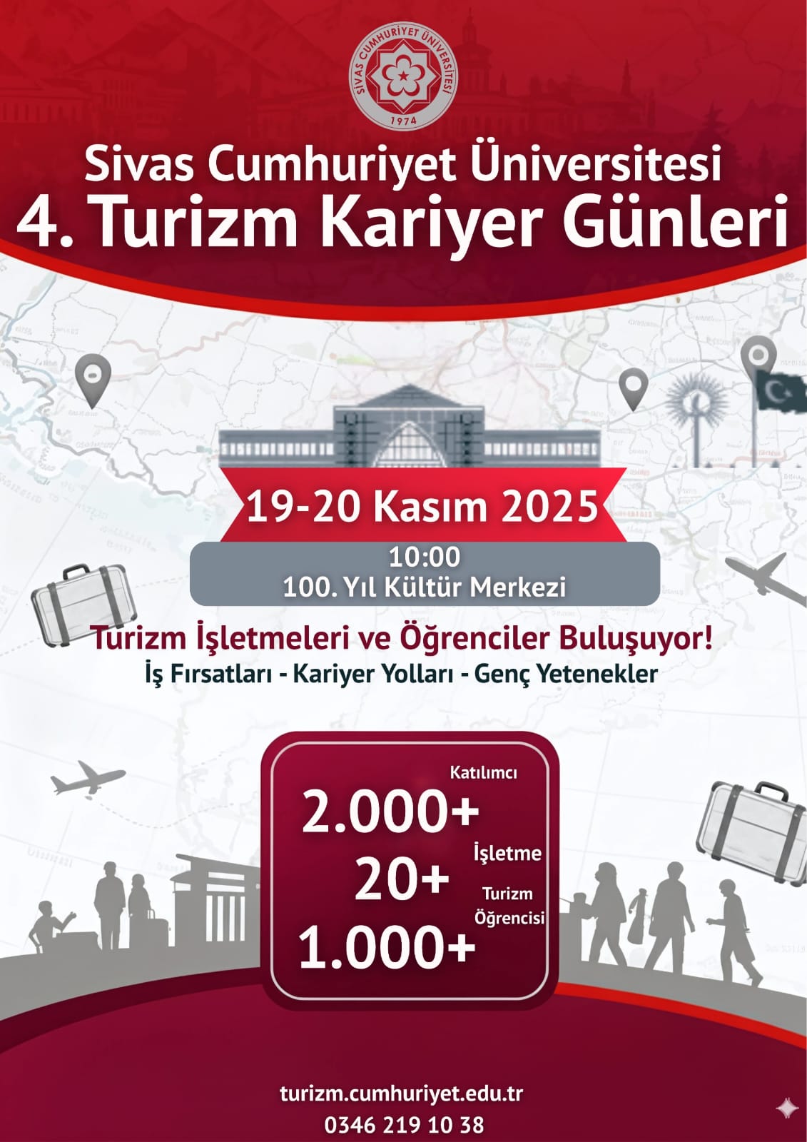 Sivas Cumhuriyet Üniversitesi Turizm Fakültesi tarafından düzenlenen 4. Geleneksel Turizm Kariyer Günleri, 19-20 Kasım 2025 tarihlerinde gerçekleştirilecektir.